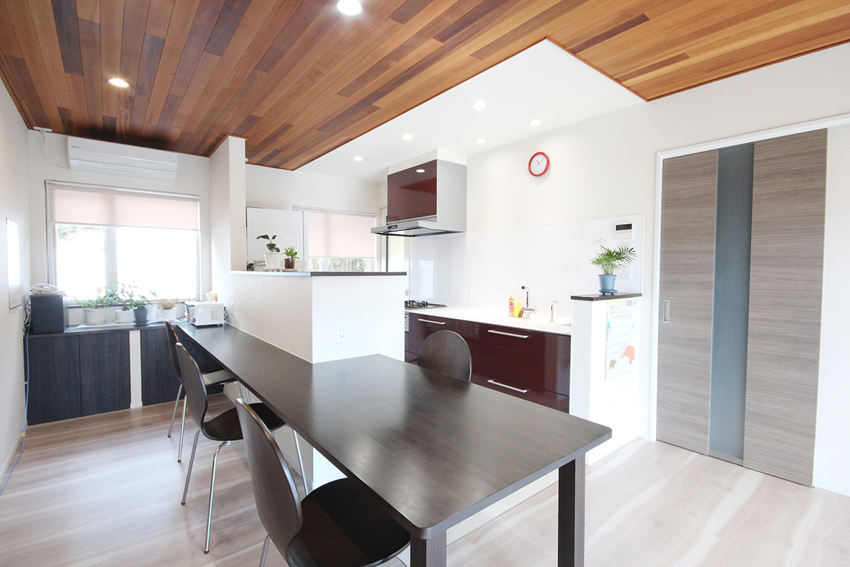 他にも天井は杉の羽目板なんです。時間が経つにつれ色が馴染んでいき、温かみを増しました。より一層木の風合いが出たような気がします。