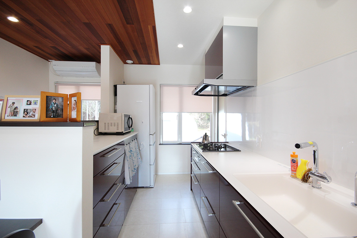 奥様からは「キッチン廻りにもこだわりました。キッチンは壁付けにしたおかげで油を使った料理の後も掃除しやすく片づけやすいんです。上部には収納を造らなかったので部屋全体がスッキリして見えます。
