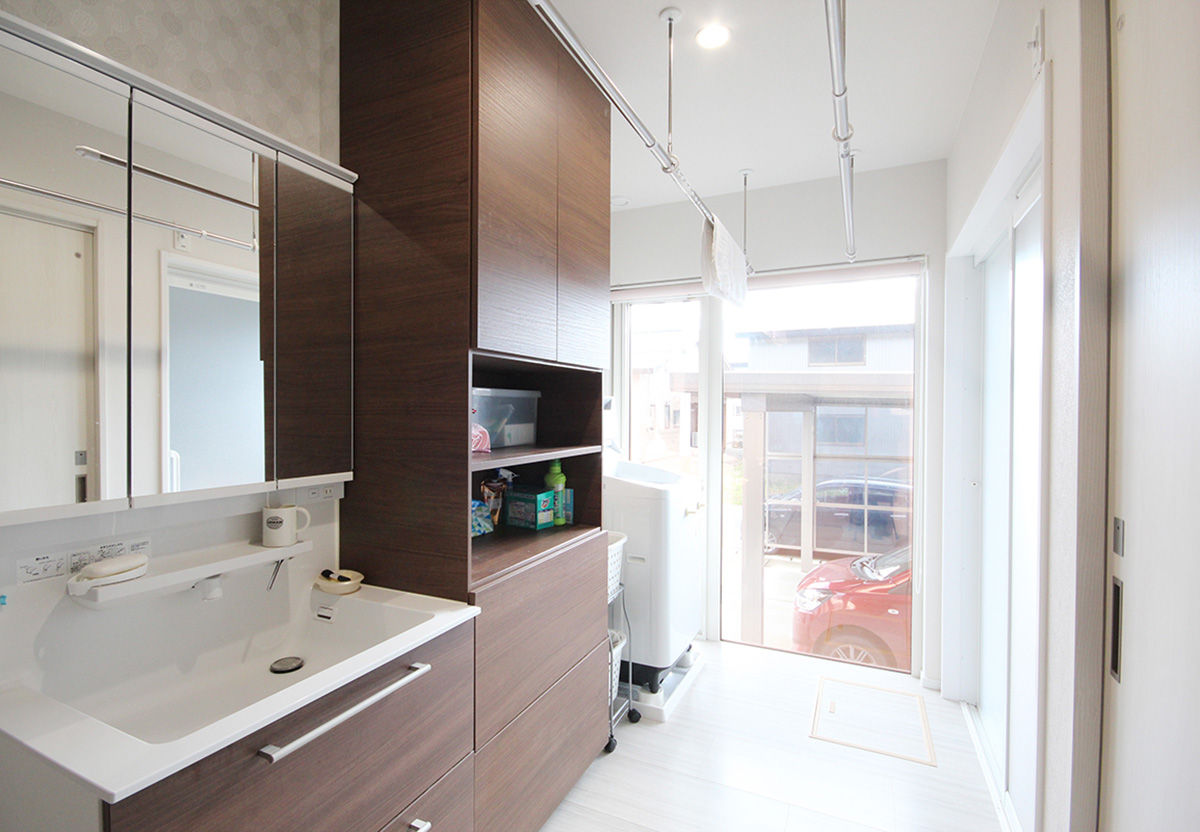 洗面所は収納を設けて洗濯後はすぐに干せて仕舞えるので動線が短くて済みます。
