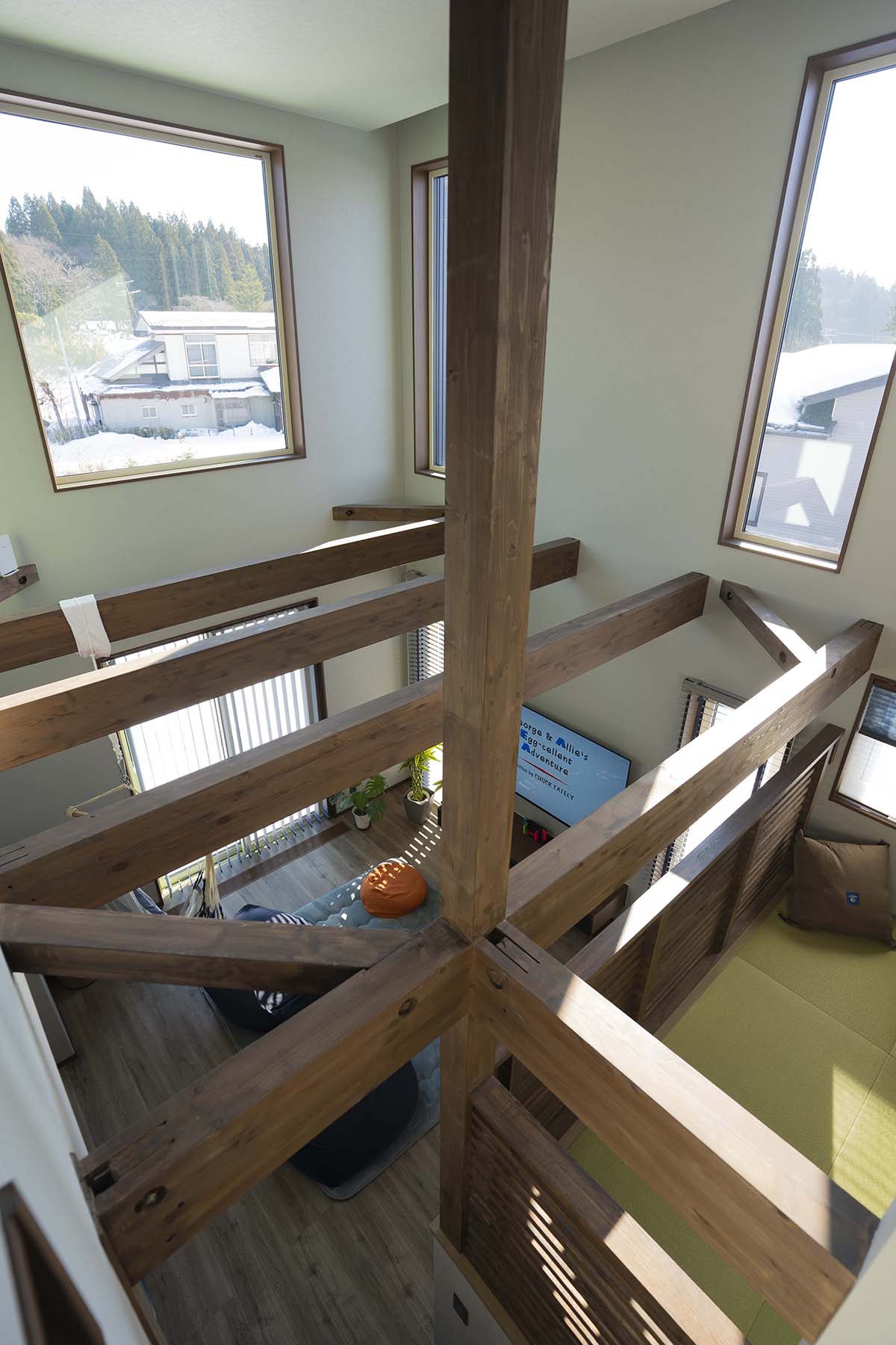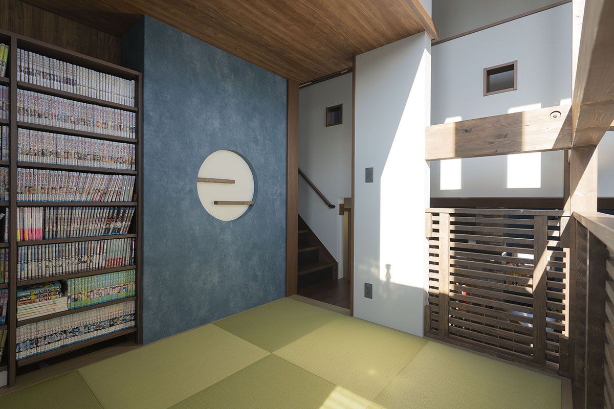 中2階では本棚を造り、家族で読書をしたり昼寝をしたり寛いでいます。吹き抜けに面しているのでリビングにいる家族の様子を伺うことができるのも嬉しいです。