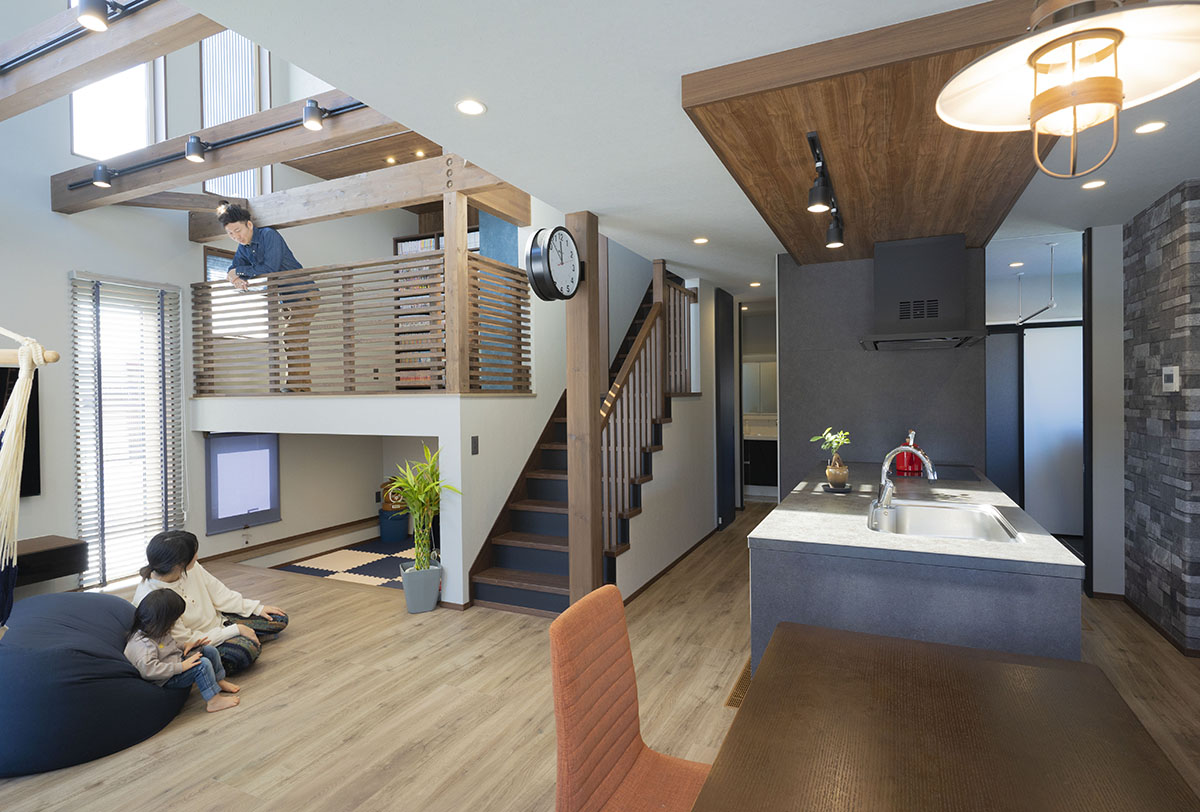 開放的でスキップフロアやたっぷりと収納スペースがあるデザインをお願いしました。設計の中村さんや営業の鈴木さんからも色々ご提案いただき、中2階を設け、和室にしました。下部はキッズスペース、上部は寝室に繋がるロフトにし、天井は梁を見せるデザインにしています。