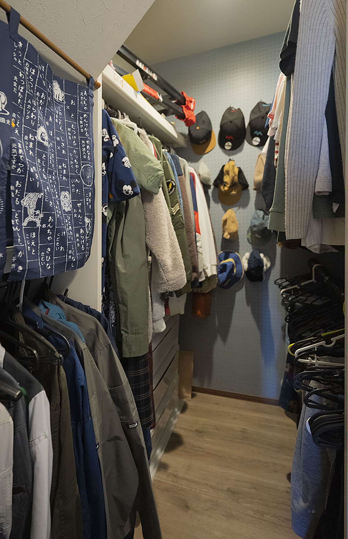 1階にはファミリークローゼットも設けました。全てハンガーパイプを付けたので洗濯してハンガーにかけて干し、そのまま仕舞えるので簡単です。服は『かける』か『たたむ』かですが、『かける』ほうが出し入れしやすく管理もラクです。奥の壁は有効ボードにし、帽子を収納しています。