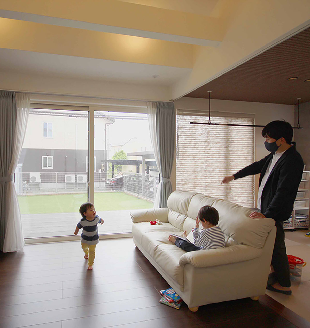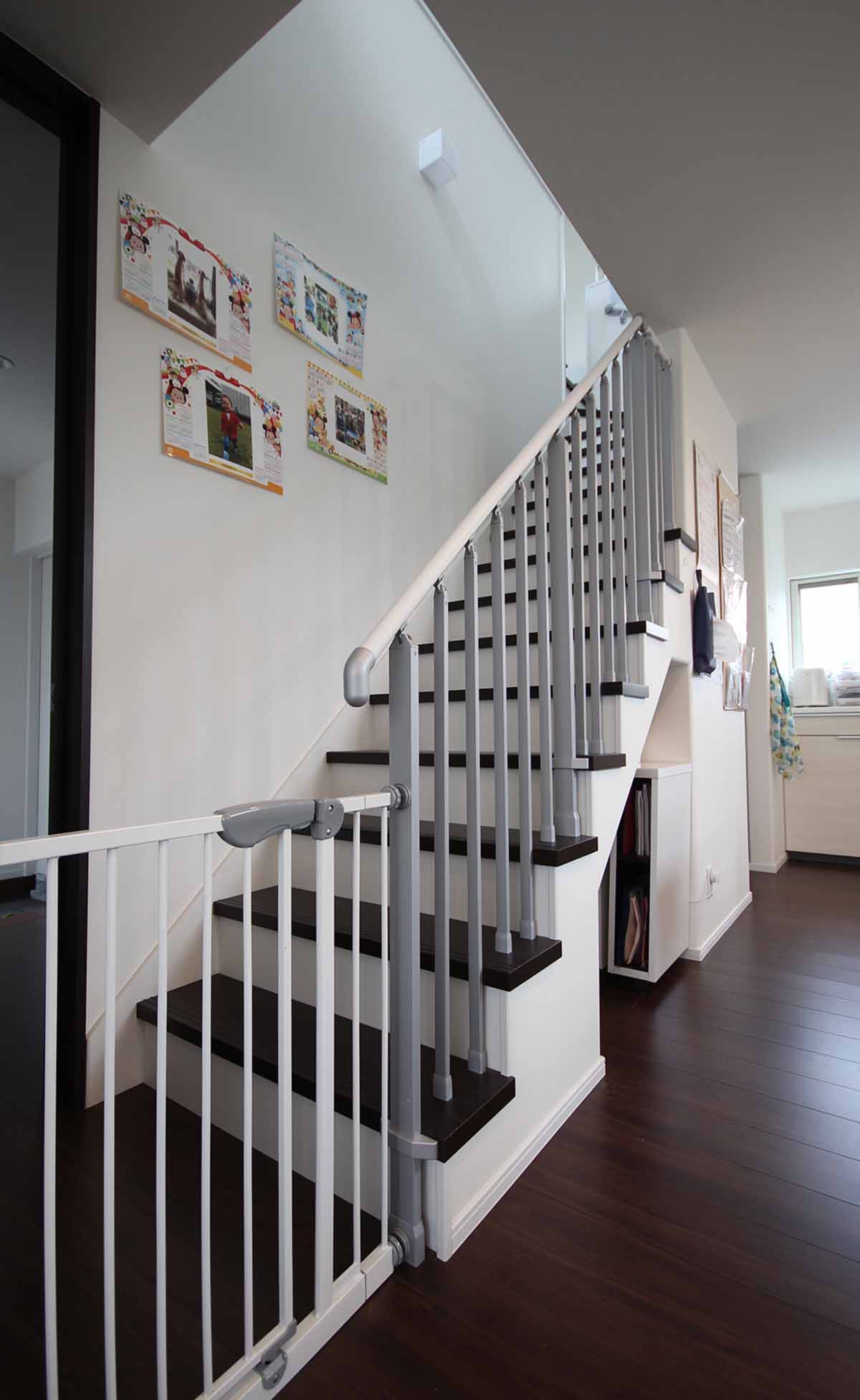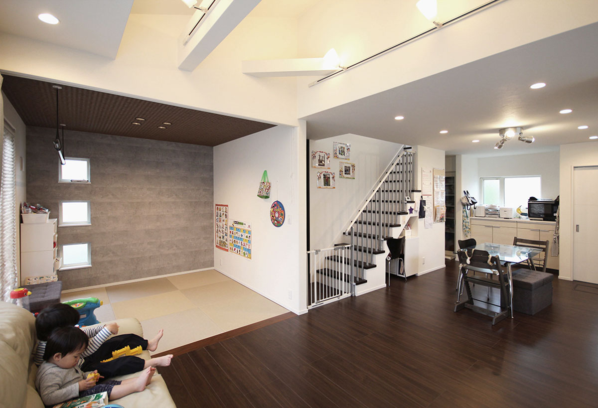 リビングに付けた階段は、子供たちに大人気で友人家族が遊びに来た時は、みんな手すりの格子から顔をのぞかせて遊んだりしています。
